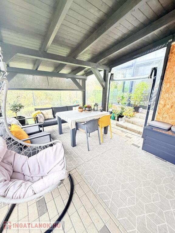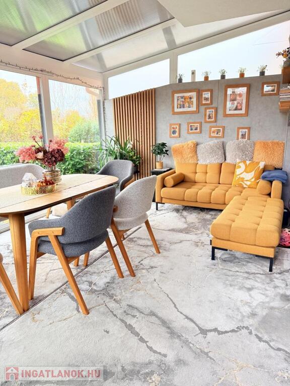 Amint belépsz, az otthon melege és az ízléses enteriőr azonnal magával ragad. A világos, tágas nappali a kerttel és a hangulatos, üvegezett télikerttel nyílik egybe – innen rálátsz a parkosított kertre és a zöldre, ahol gyakran őzek néznek be a kerítésen.