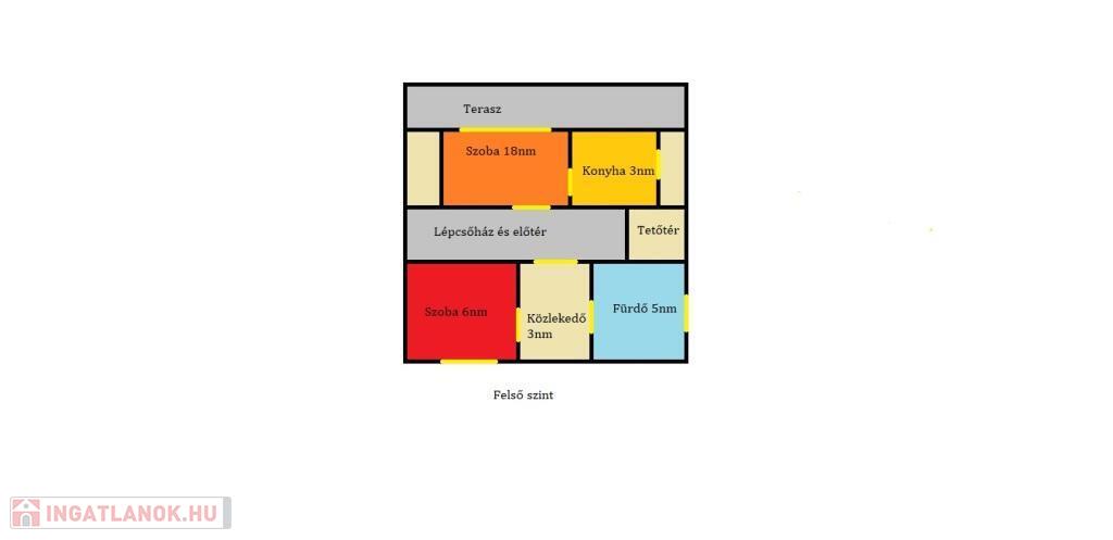 Az emeleten egy terasszal határos szoba. tetőtér síkjában kis konyha, fürdőszoba és egy hálófülke lett kialakítva.
