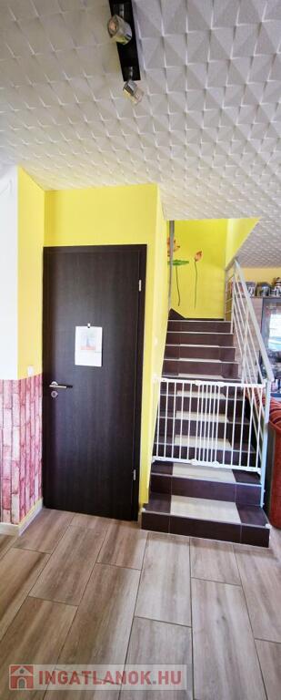 Az ingatlan alsó szintjén nappali, étkező, konyha, előszoba, kamra és illemhely található. A nappaliból a 12 nm-es teraszra és közvetlenül a kertbe juthatunk. A tetőtérben 3 szoba, fürdőszoba került kialakításra, a fürdőszobában zuhanykabin és fürdőkád, valamit illemhely is a rendelkezésünkre áll.