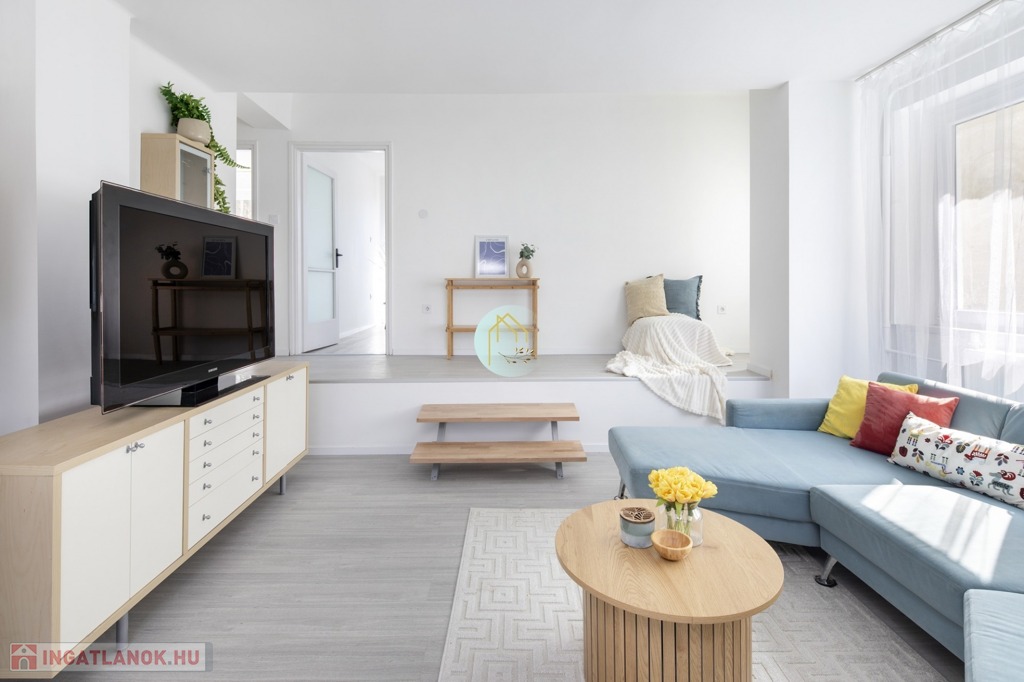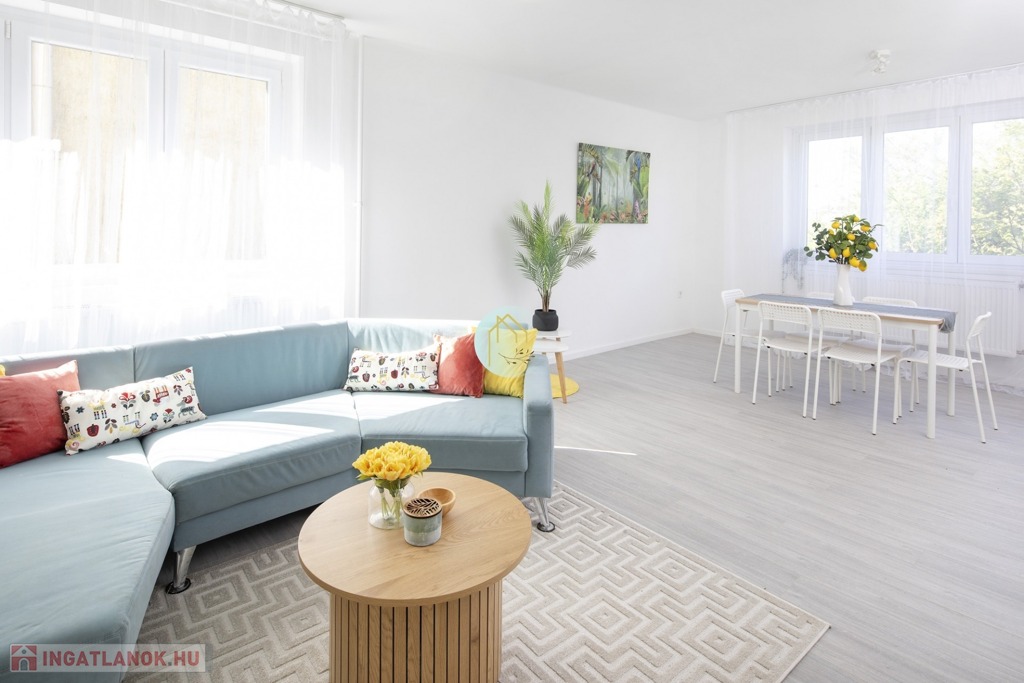 -Tágas és szinteltolásos nappali - étkező, napfényes konyha, előszoba, 2 nagy méretű külön nyíló erkélyes szoba, fürdőszoba-Wc, plusz vendég Wc, és tároló.