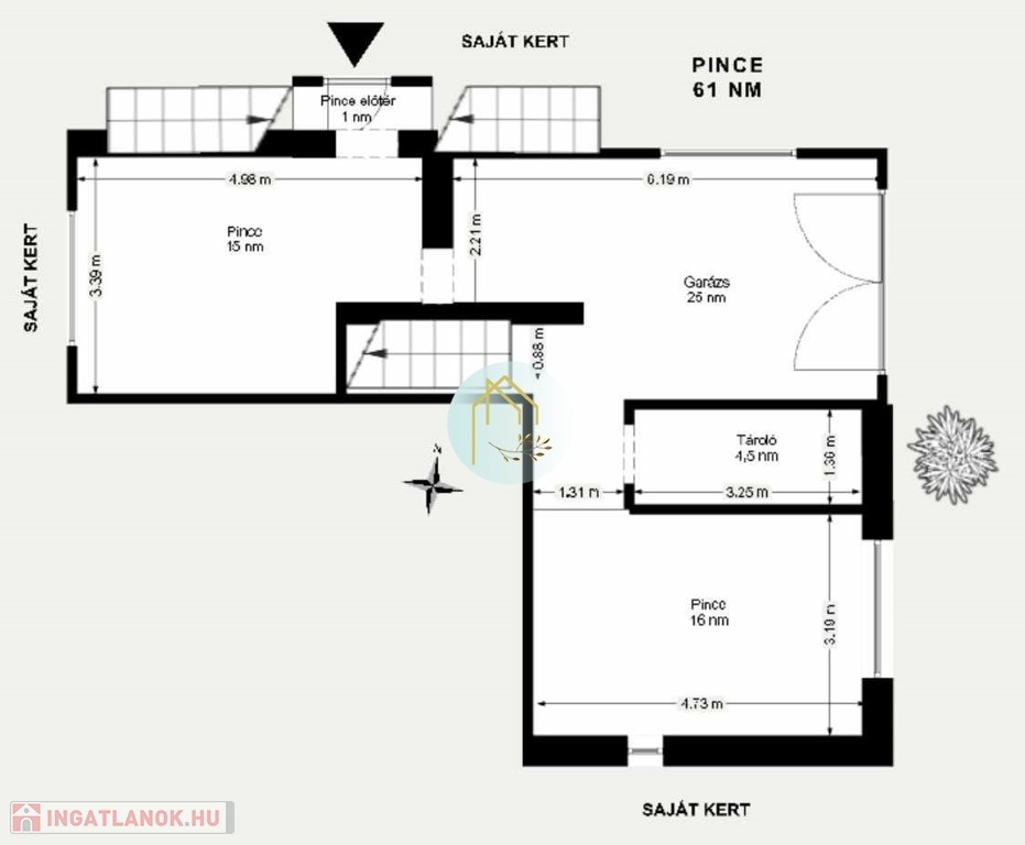 -Földszinten garázs, gépészeti helyiség, nagy méretű tároló, amely akár vállalkozás üzemeltetésére is alkalmas lehet.
