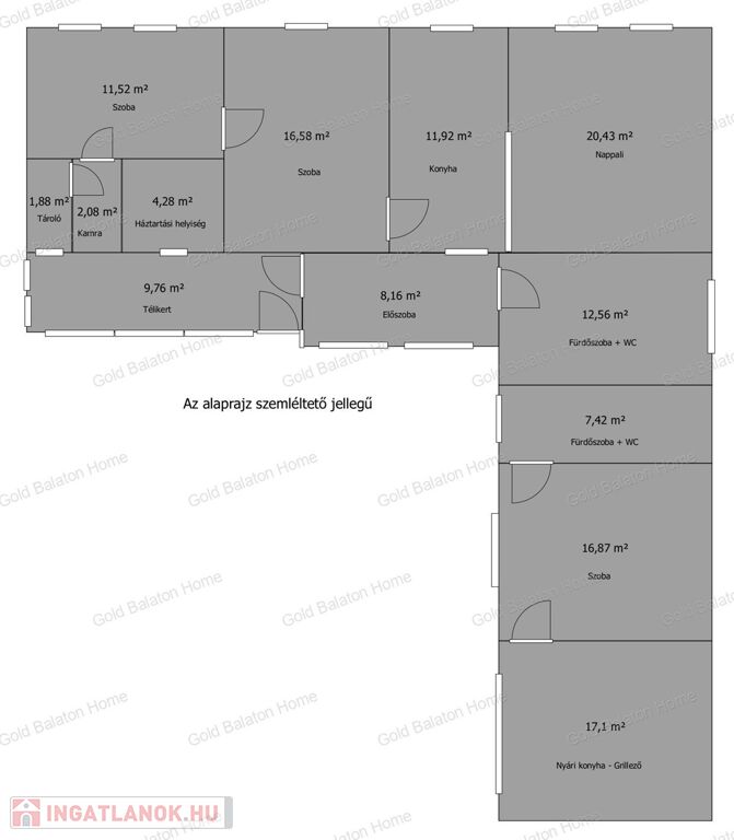 - főépület: télikert, előszoba, nagy nappali, konyha, 2 hálószoba, 1 fürdőszoba káddal, zuhanyzóval + WC, tároló, kamra, háztartási helyiség