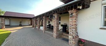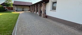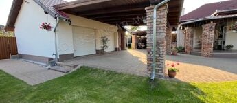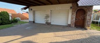 -Garázs előtt 6x6 méteres féltetős, viakoloros autóbeálló.