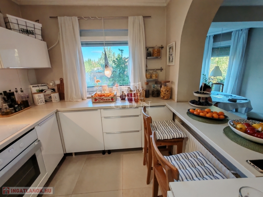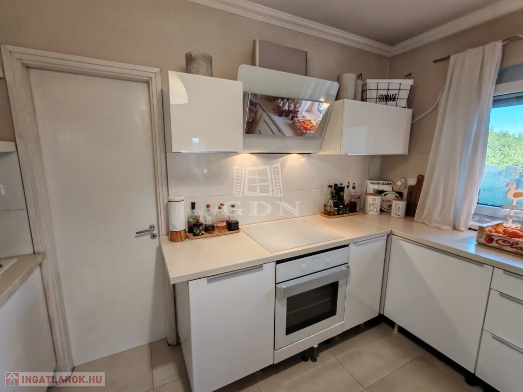 A napfényes konyhában fehér magas fényű, U alakban beépített konyhabútor került, kényelmes, kihúzható fiókos tároló rendszerrel, nagy egybefüggő munkafelületekkel, fehér Gorenje Ora Ito indukcióslappal és 14 programos multifunkciós sütővel, savmaratott üveg/króm Elica páraelszívóval és fehér Blanco Elon silgránit mosogatóval.