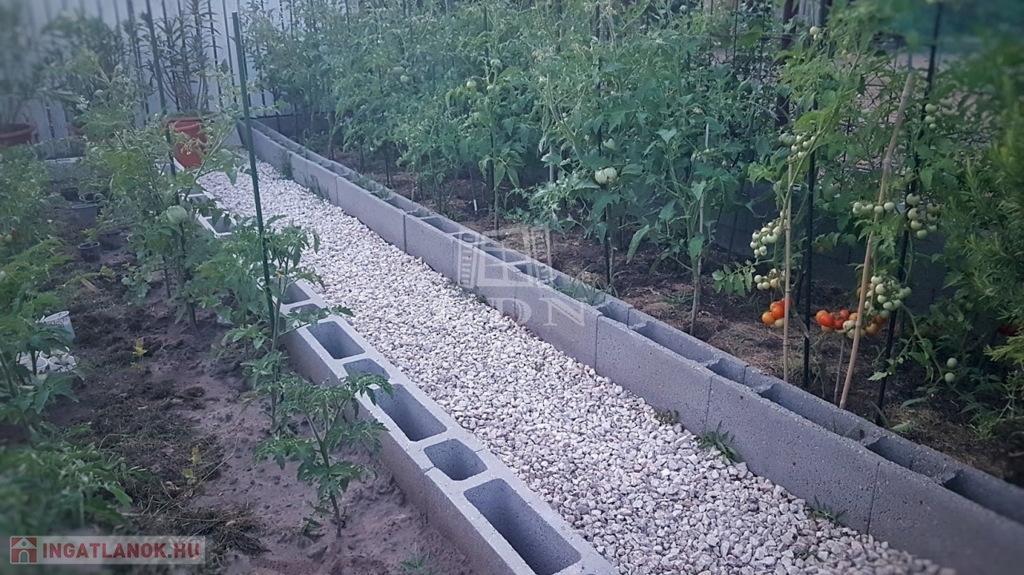 A kert felső részében 3 db 10×1 méteres magas ágyásban konyhakert, egy 4,5×1,2 m-es süllyesztett fémpalástos fóliás medence, napozó, grillező, pihenő terület kapott helyet. Az ápolt növényzetnek köszönhetően teljesen elzárt a külső környezettől. Locsolást 37 m mély fúrt kút biztosítja .
