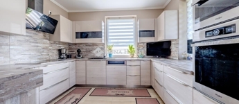 A földszinten elegáns nappaliétkező tér, három lakószoba, praktikus gardrób, valamint tolóajtóval szeparálható konyha kapott helyet, amely igény szerint egy légtérben vagy elkülönítve is használható.