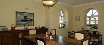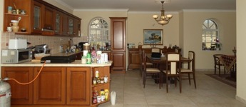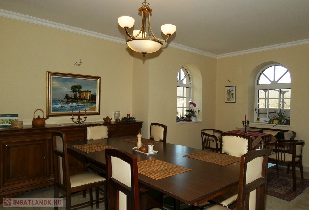A 145 m2-es földszinten egy télikerten kersztül léphetünk a közlekedőbe, ahonnan megközelíthető a tágas, jól benapozott nappali, a konyha-étkező, kamra, a dolgozószoba, és egy hálószoba külön fürdőszobával és gardróbbal.