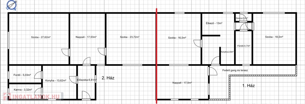 Az első házrész hasznos beltere 77,3 m2, található benne 3 külön bejáratú szoba, konyha és étkező egy helyiségben, közlekedő, kamra, fürdőszoba + WC. Az épülethez 15,7 m2-es fedett terasz tartozik.