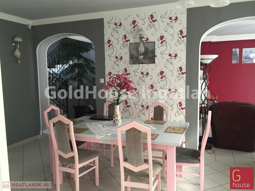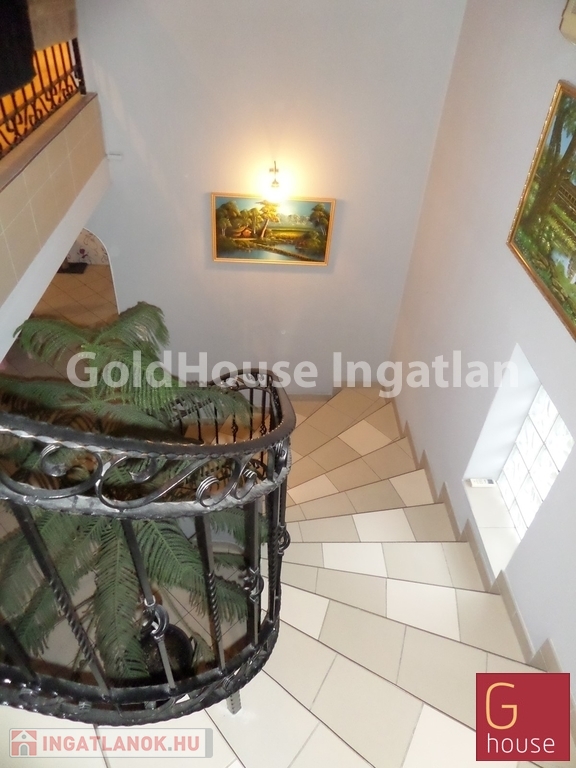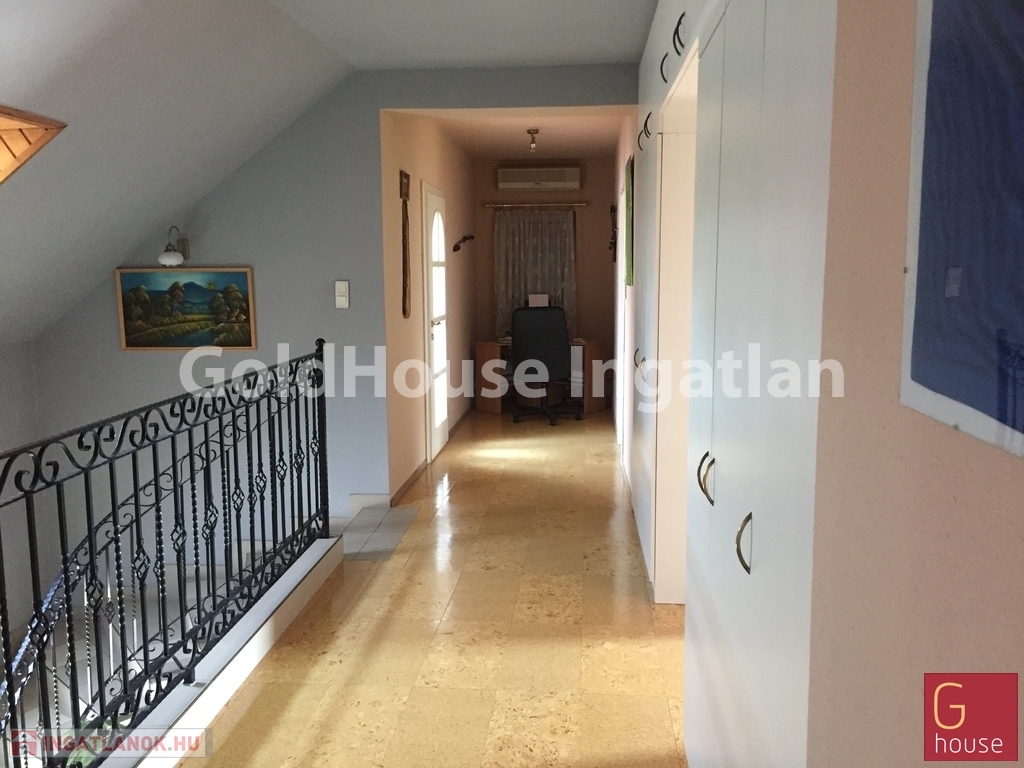 Az akár a garázsszintről, akár az udvarról is közvetlenül megközelíthető földszinten boltívekkel a térérzetet növelve világos, tágas étkező, konyha közvetlen kapcsolattal a télikerttel, WC, spejz, mosókonyha, vendégszoba fürdővel és a családi összejövetelek, a hideg téli estéken a kandalló melletti meghitt beszélgetések ideális színhelyéül szolgáló nappali került kialakításra, még az emeleti részen négy külön hálószoba és három fürdőszoba. Mind a földszinten, mind az emeleten beépített szekrények szolgálják a felgyülemlő holmik eltárolását, ezáltal sem csökkentve a térigényt. A szobák mindegyike erkéllyel rendelkezik, ablakaik biztonsági redőnnyel ellátottak.