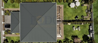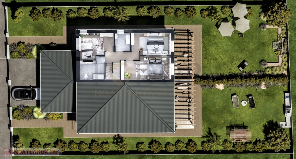A 849 m²-es telken épülő ingatlan mindkét fele saját, 424 m²-es leválasztott telekrésszel rendelkezik, valamint egy viacolorral burkolt kocsibeállóval is ellátott.