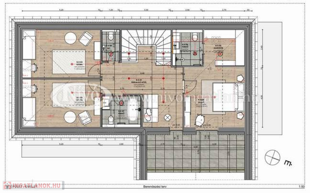 - A földszinten amerikai konyhás nappali, hálószoba, fürdő+WC, kamra, fedett terasz, fedett autóbeálló, az emeleten pedig további 3 hálószoba, 2 fürdő+WC,előtér, gardrób, WC, valamint egy fedett terasz kerül kialakításra.