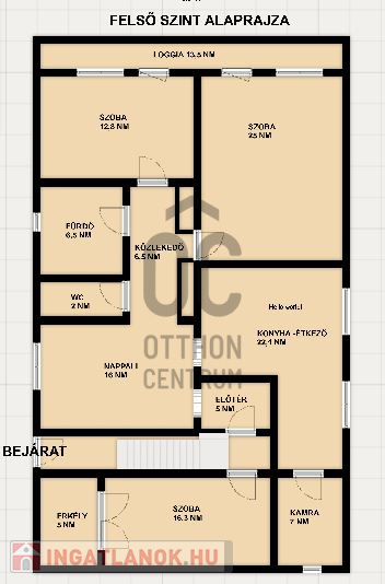 ✔ Felső szinten: 3 hálószoba, nappali, konyha+étkező, kamra, fürdő, WC