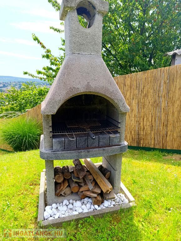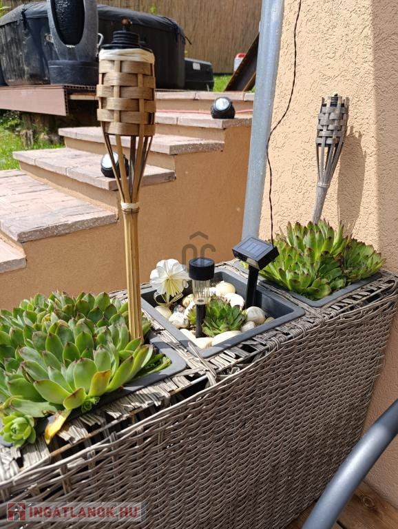 869 nm-es körbekerített, teraszos kialakítású telken fekszik, kerti sütővel, Jakuzzival, játszótérrel, trambulinnal, kerti kiegészítőkkel, tágas garázzsal és fedett gépkocsi beállóval melyek benne vannak az árban