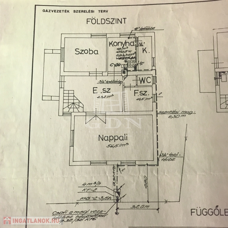 A földszinten egy központi nappaliból nyílik 2 szoba , konyha , fürdőszoba, külön WC, és az emeletre vezető lépcső.