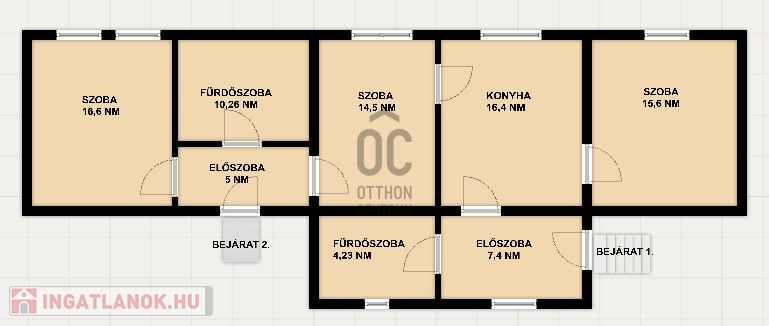 3 szoba, 2 fürdőszoba, 2 bejárat, 1 konyha