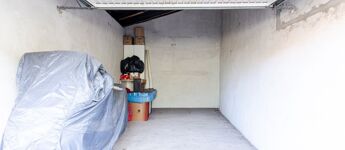 Az ingatlan egy zárt belső udvarban található, amely elektromos kapuval közelíthető meg. A garázs billenő kapuval felszerelt, jó állapotú, beton aljzatú és festett falakkal rendelkezik.