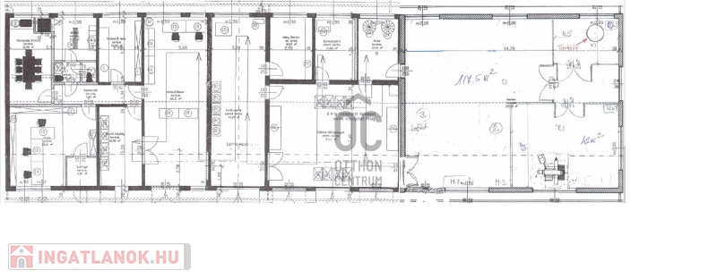 Irodaépület földszint: 316 m2 (11,7 x 27,0 m); + emelet: tetőtér beépítéssel