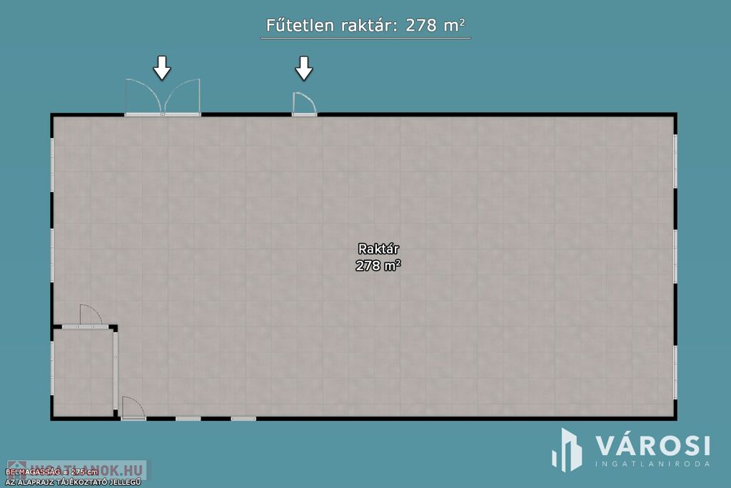 A raktár belső mérete: 11,6 X 24 méter. A belmagasság: 275 cm.
