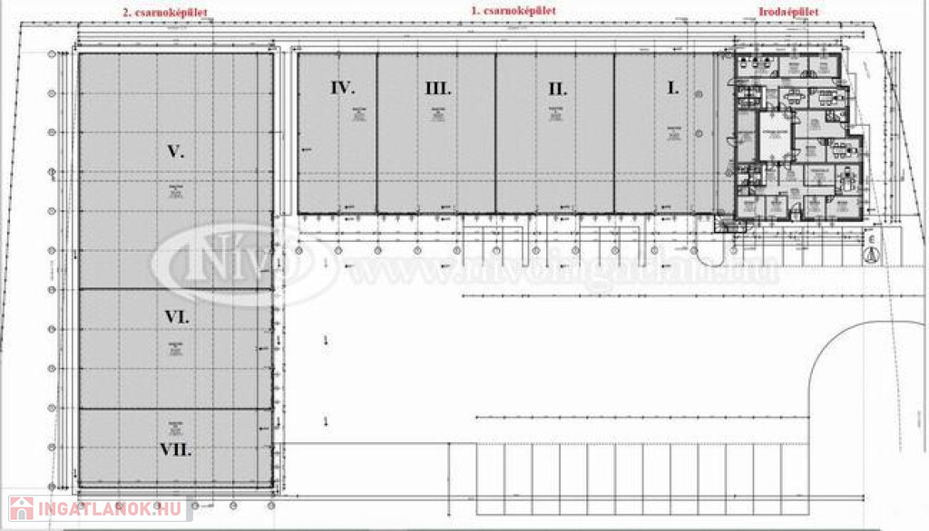 Terület: 8200 m2-es bekerített, összközműves, parkosított, térkövezett, felszíni parkolókkal ellátott.