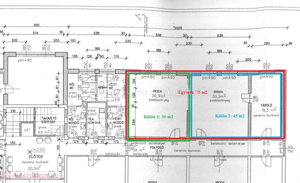 Az iroda blokk egyben 75 m2 is kivehető, illetve ebből külön is bérbe vehető egy egy helyiségből álló egy 30 m2 iroda, vagy egy két helyiségből álló (30 m2 és 15 m2, a hirdetett) 45 m2-es iroda is. A helyiségek a folyosóról külön ajtóval megközelíthetőek.
