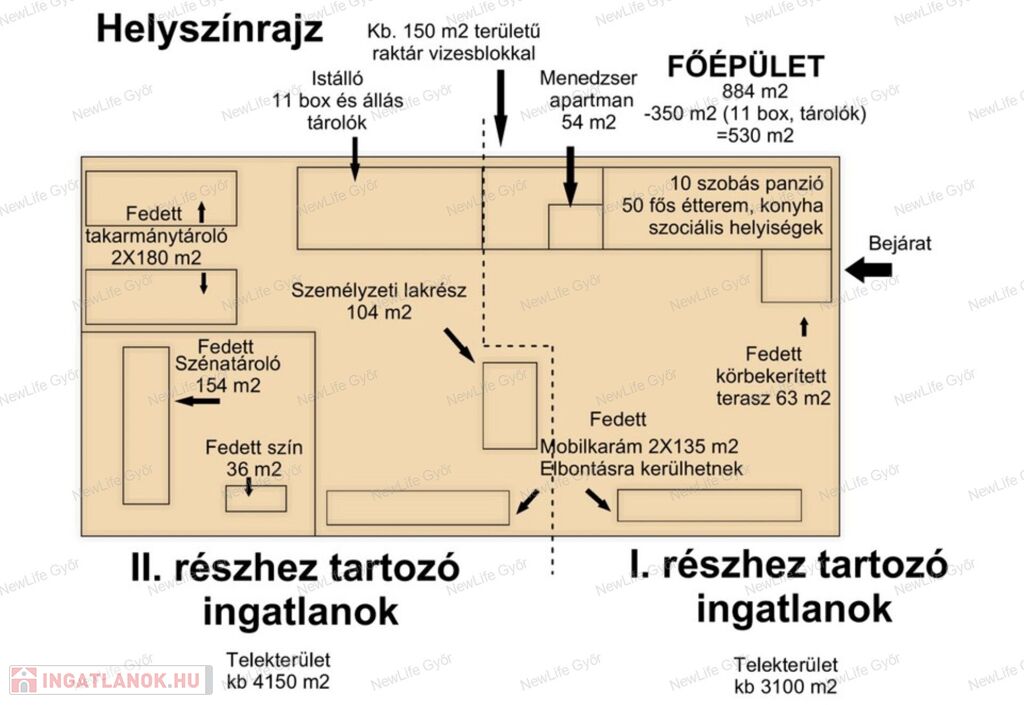 II. rész irányára: 194 MFt, mely tartalmazza a főépület végét, kb 350 m2-nyi, 11 boxot és állást, tárolókat, 2*180 m2 fedett takarmánytárolót, 154 m2 fedett szénatárolót, 34 m2 méretű fedett színt és egy személyzeti komplett lakrészt 104 m2en. A főépülettel szemben található (másik) 135 m2 területű fedett mobilkarám, mely szükség esetén bontható, vagy autóbeállók alakíthatók ki belőle.