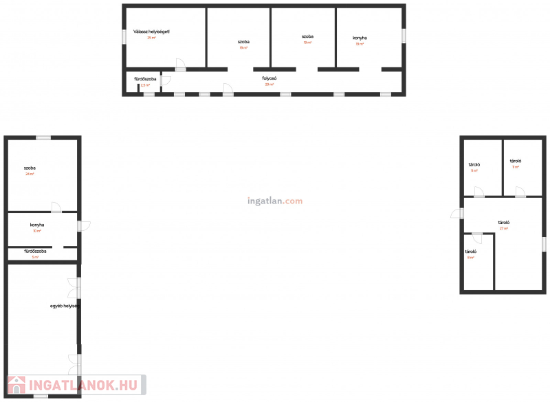 Ebben az épületben 3 nagy területű szoba, konyha, fürdő, és a már említett folyosó áll.