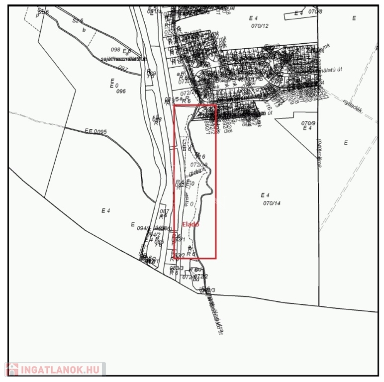 A tanya közvetlen szomszédságában lévő telek, ami szintén ELADÓ, a tulajdoni lap szerint, „Rét, Járási mintatér„ besorolású külterület, 6367 m², 6 minőségi osztályú, 8.85 aranykorona értéket képvisel.