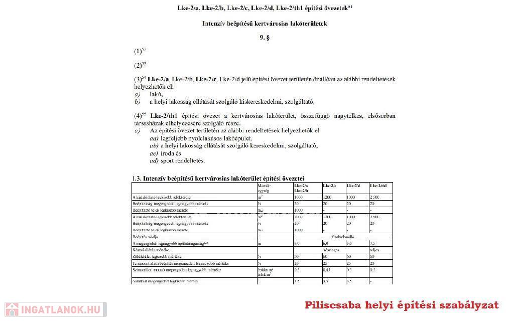 A helyi építési szabályzat adatai alapján 20%-os a beépíthetőség, maximum 6 méteres épületmagassággal, szabadonálló épülettel (3,5 méter oldalkert), 0,5%-os szintterületi mutatóval és 60% zöldterülettel lehet tervezni.