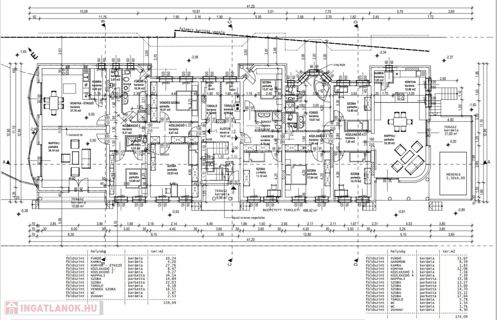 A lakások nettó lakóterülete 159 m2 és 174 m2, a pince szinten pedig mindkét lakás számára tároló helyiségek és garázsok lettek tervezve, melynek területe 190 m2.