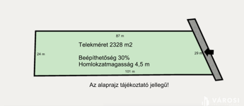 A fenyőerdővel körülvett telek mérete 2328 m2, amely maximális beépíthetősége 30%, lakóépület építése esetén 4,5 m a maximális homlokzat magasság.