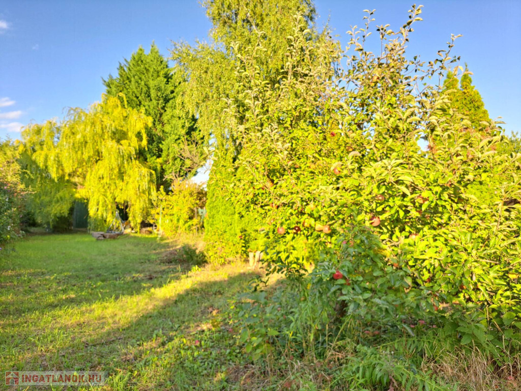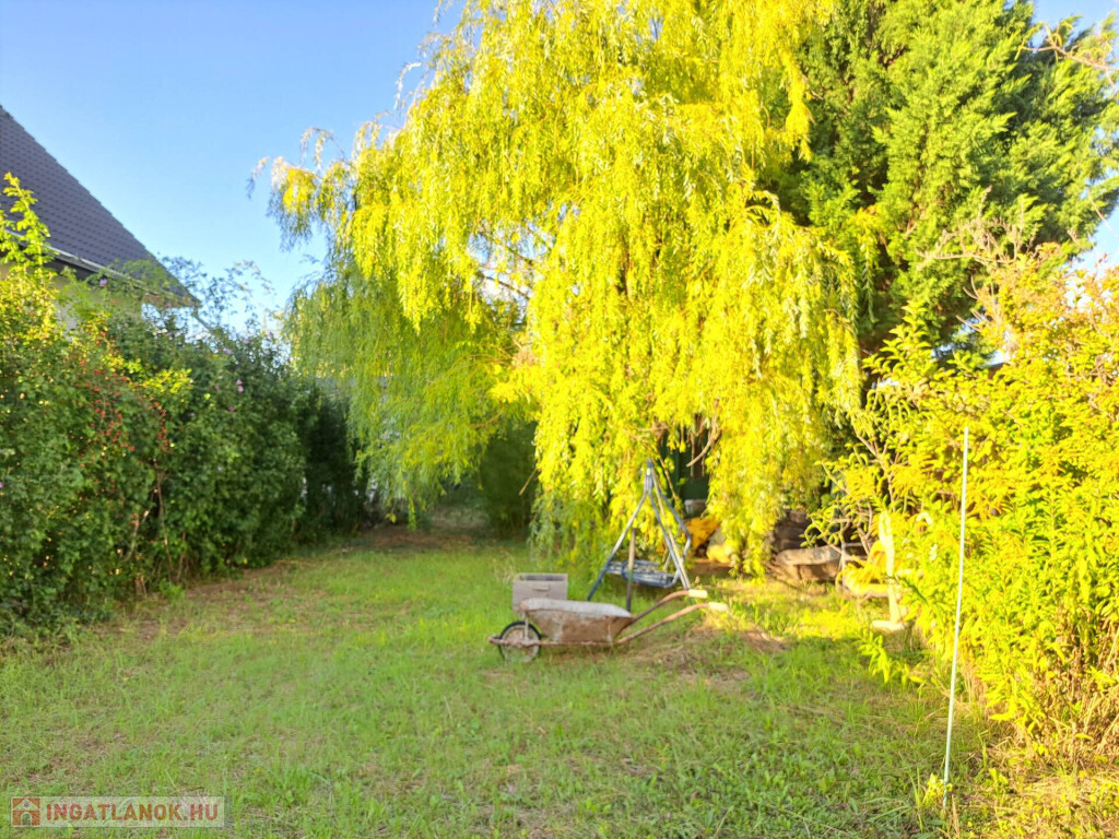 Rengeteg örökzöld, fűzfa, gyümölcsfa. A faház mögött egy művelt magaságyás lett kialakítva. Igazi "MESEKERT"!