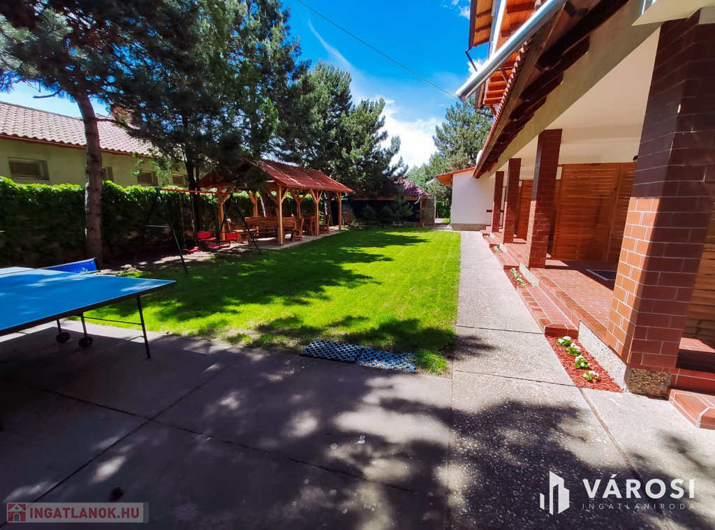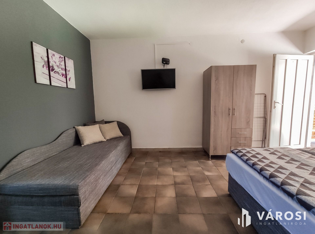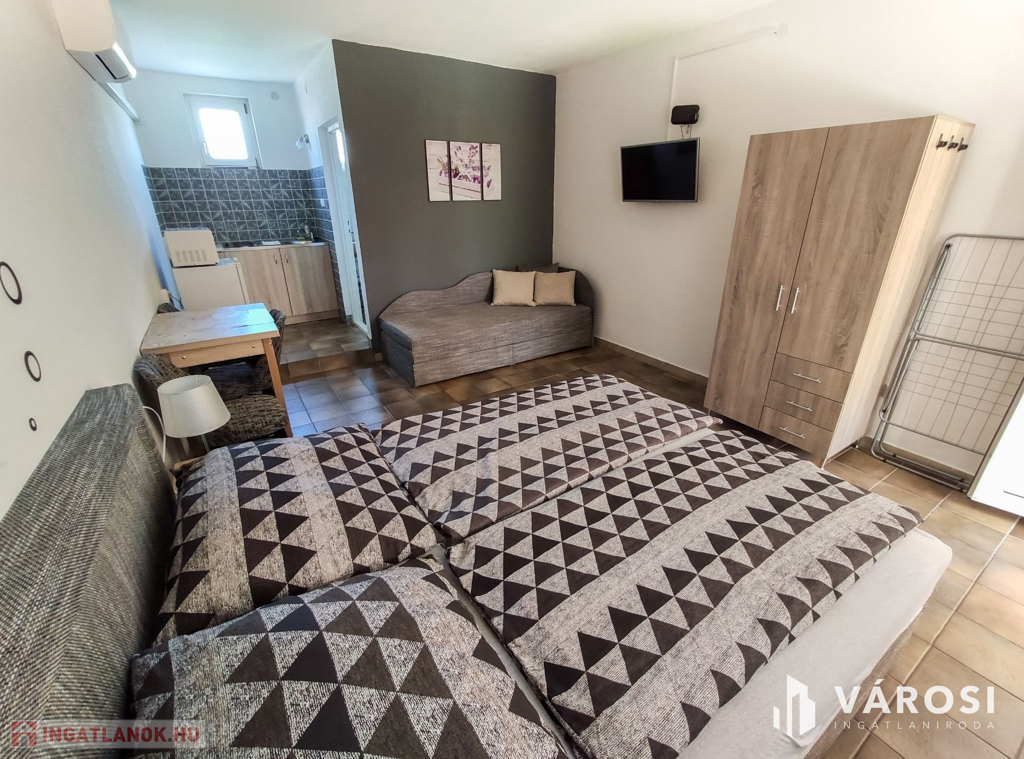 Siófok kertvárosi részében eladó egy 15 apartmanból álló apartmanház! Precízen átgondolt, rendkívül praktikusan megtervezett, bruttó 500 m2-es házról van szó. Ellentétben a legtöbb hasonló balatoni ingatlannal ez az épület kifejezetten kiadásra épült, nem utólagos átalakítások eredménye. Ennek megfelelően mind a 15 apartmanjához saját felszerelt konyha és fürdőszoba tartozik. Mindegyik külön bejáratú. Az összes lakóegységnek hűtő-fűtő hőszivattyús klímával van megoldva a hűtése és a fűtése. A "H" tarifás mérőóra fel van szerelve az ingatlanra, így a fűtése rendkívül gazdaságos. A használati meleg vizet gázbojler biztosítja.