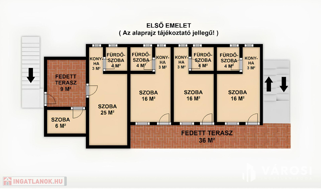 Az apartmanok elrendezése lehetővé teszi a tulajdonosnak és/vagy a gondnoknak is az állandó ott tartózkodását, mivel 2 apartman a ház egyik oldaláról közelíthető meg, míg a többi 13 a ház másik oldaláról, így azok elszeparáltan használhatóak. A ház alatt egy nagy 25 m2-es pince található, mely jelenleg gépészeti helyiségként valamint műhelyként funkcionál.