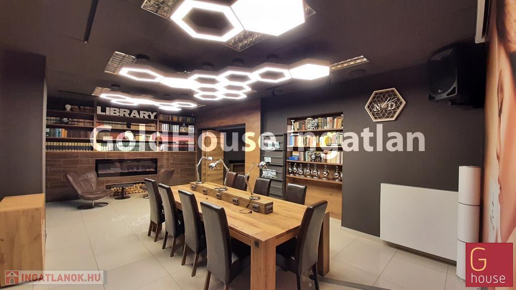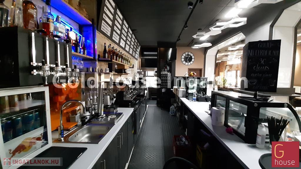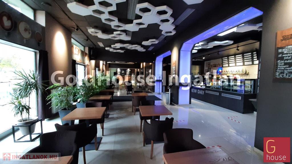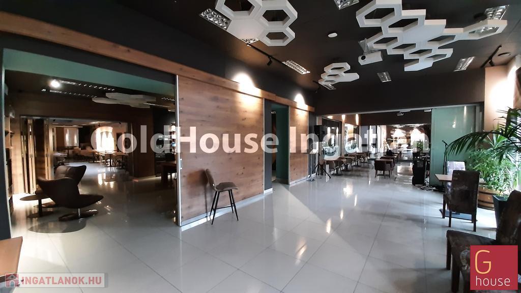 Tágas vendégtér, különterem, könyvtárszoba látványkandallóval. Vendéglátás esetén a terület tovább bővíthető. Teraszozható. Saját zárt 45 nm-es privát terasszal és udvari bejárattal is rendelkezik. Berendezés: kávégépek, mosogatógép, villanysütő, indukciós főzőlap, szendvics sütő, hidegen tartó pult, jéggép, hűtők, beépített hűtők, juice gép, székek, asztalok stb.