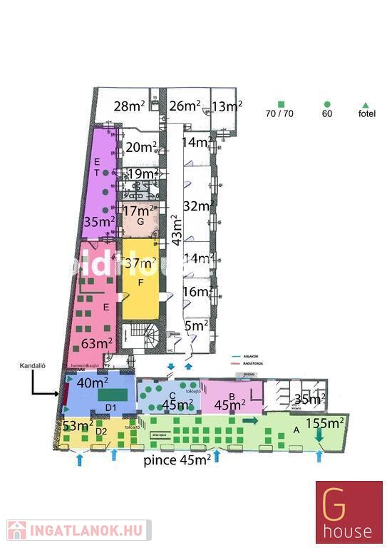 Jelenleg a fele terület berendezett rendezvényterem-kávézó-bár. Meleg konyhai elszívó kialakítható. Több vendégmosdóval rendelkezik. A pinceszinten előkészítő konyha és raktár került kialakításra.