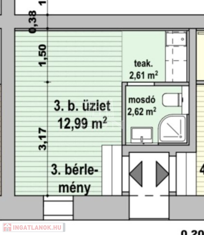 Az üzlethelyiségben zuhanyzós fürdő, wc, konyhabútorral felszerelt teakonyha is található.