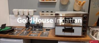 Berendezés: hűtő, mosogató, pult, székek, asztalok, elektromos pizzakészítő gép, szendvics és krumplisütő, rezsó, kávédaráló, kávégép, melegen tartó pult, állványok, egyéb konyhai eszközök.