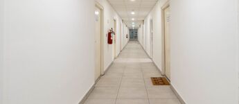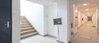 The three-story office building features a renovated electrical network and plastic windows, providing a modernized background for the offices.