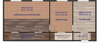 A három egymásból nyíló helyiségből álló iroda az irodaház 2. emeletén helyezkedik el. A helyiségek laminált padlóval, illetve szőnyegpadlóval burkoltak.