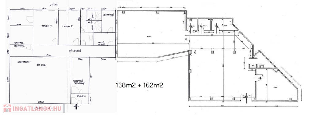 Az üzlethelyiség jelenleg két részre, egy 138m2 és egy 162m2 alapterületű egységre van bontva. Igény esetén összenyitva, egyben vagy megosztva, a jelenlegi állapotában is bérbe vehető.