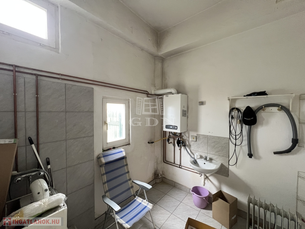 Homlokzati nyílászárók műanyag 2 rétegű, nyeregtető szerkezet kialakítás lemeztetővel, újszerű Ariston kombicirkó fűtés, ipari áram, stb.