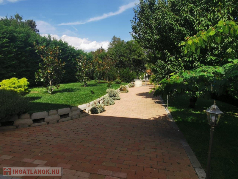 A telek 840 m2, utcafronti szélessége 50 m. A kert rendezett, dísznövényekkel telepített. Autók parkolására az utcán kialakított, térkövezett területen van lehetőség.