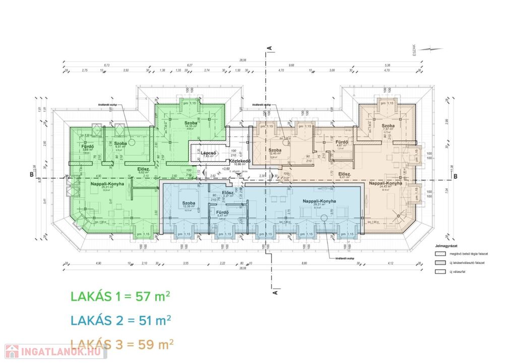 - Tetőtér = 3 db újonnan kialakított lakás (51 m2 + 57 m2 + 59 m2)