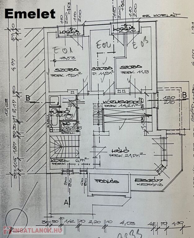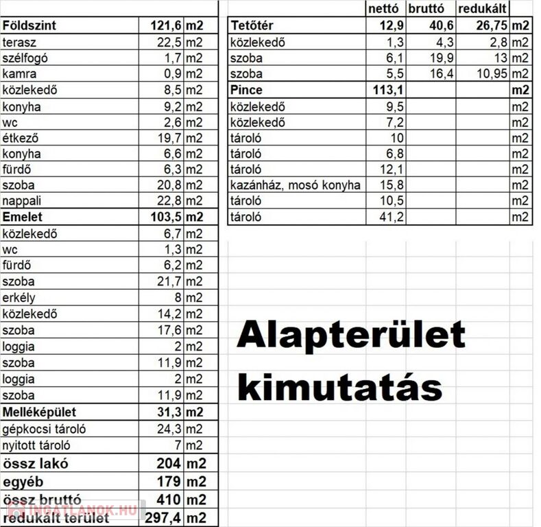 A pince, földszint és az emelet alaprajzai a fotók között megtalálhatók, az alapterület kimutatással együtt.