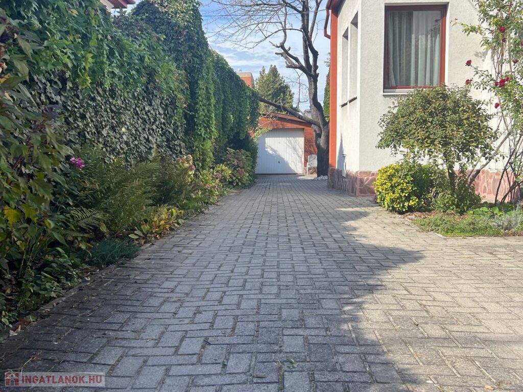 A ingatlanhoz megérkezve automata, kétszárnyú kapun keresztül, térkövezett közlekedő felületen jutunk garázsba.
