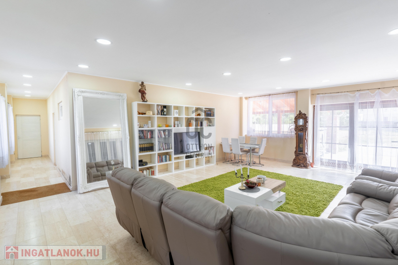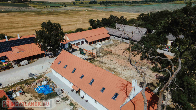 Tartozik még az igazán egyedi birtokhoz egy 230nm-es ház is,melyben 2 garázs, konyha-nappalival egybekötve és 3 szoba is, melyekhez saját fürdőszoba tartozik. A aszobákat és a nappalit is meg lehet közelíteni a közlekedőből, vagy a tornácos teraszról is. A teraszon egy kis külső pult, nyári konyha is fellelhető. Az udvaron teniszpálya és medence is kialakításra került. Ezen ingatlan fűtése szintén hőszivattyúval megoldott.