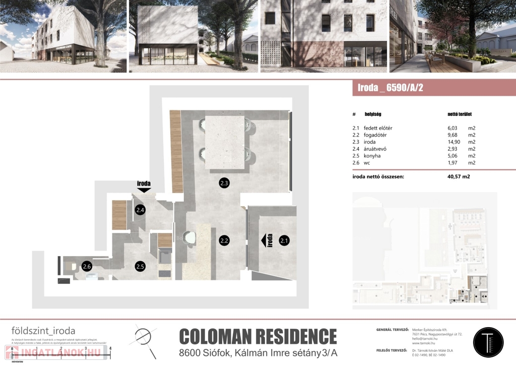 Siófokon a Fő térnél, a Kálmán Imre sétányon, új építésű, korszerű társasház földszintjén található 40,57 m2-es modern iroda eladó. A minőségi anyagokból, igényes kivitelben készülő ingatlannak két bejárata is van, amelybe a Sétány-, illetve a belső udvar felől is be lehet lépni egy-egy fedett előtérből, ahol tágas 9,68 m2-es fogadótér, valamint 14,9 m2-es iroda található, továbbá található még egy teakonyha, tároló, illetve wc helyiségek is. Az épület fűtése korszerű, DAIKIN levegő/víz hőszivattyúval kerül kivitelezésre, és légkondicionáló is felszerelésre kerül. Az iroda könnyen megközelíthető és parkolási lehetőség is megoldott a közelben. Az ingatlan ideális lehetőség egy nívós vállalat siófoki irodájaként. Az ingatlan vételára: 52,741,000 + ÁFA!