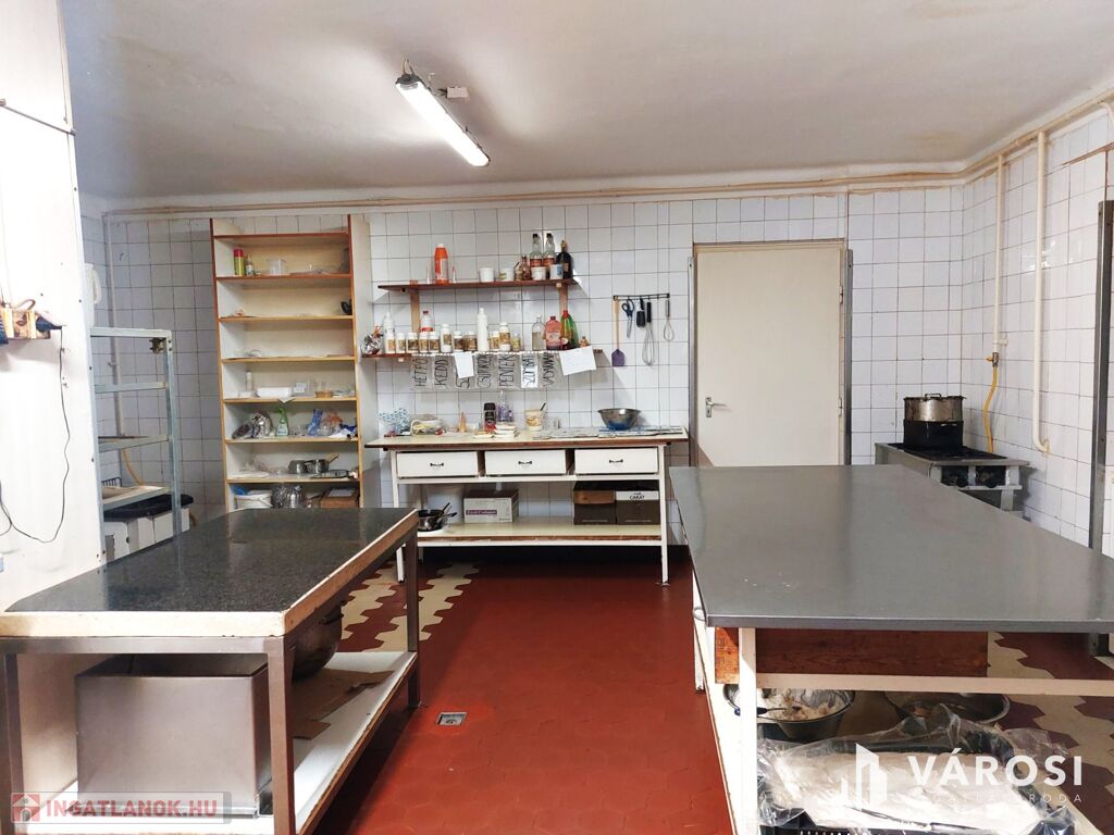A földszinten, 83m2 alapterületen a több, mint 40 éve működő, ma is népszerű Jókai Cukrászda, amelyhez a melléképületben kialakított, professzionális berendezésekkel felszerelt cukrászüzem tartozik. A városban és környékén szervezett nagy rendezvényekre, esküvőkre a süteményeket többnyire innen rendelik. A cukrászatban használt különleges olasz fagyigépek, pasztőröző gépek és más specifikus cukrászüzemi berendezések, felszerelések magas értéket képviselnek, melyet az eladási ár tartalmaz.