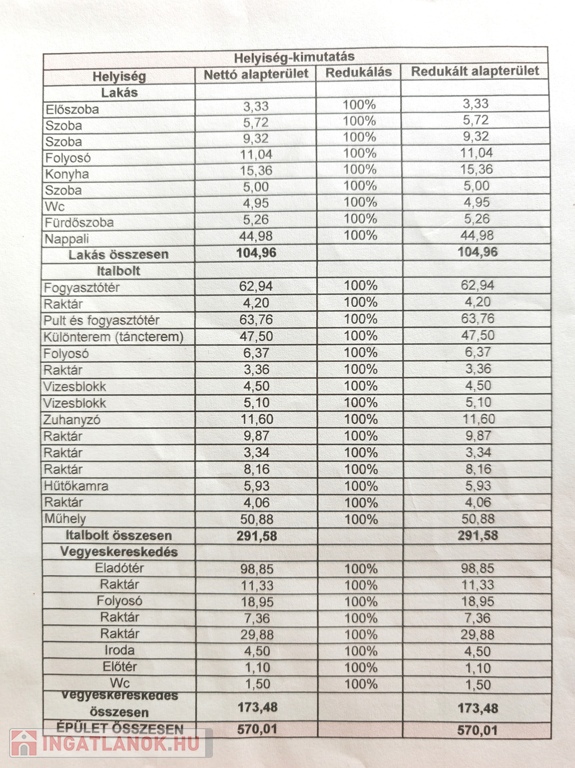 A mintegy 32 helyiségből álló épületkomplexumban a fő kereskedelmi- és vendéglátó-helyiségek mellett sok raktárhelyiség, illetve egy hűtőkamra is helyet kapott. Az ingatlan előtt, illetve a telken belül bőségesen van parkolóhely.