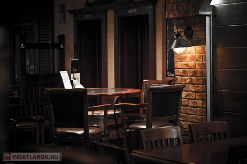 -A vendégtérben nagy üvegfelülettel rendelkező üvegportál, bőr és fa bútorzat, berendezés, egyedi csillárok, hangulatos dekoráció lett kialakítva.